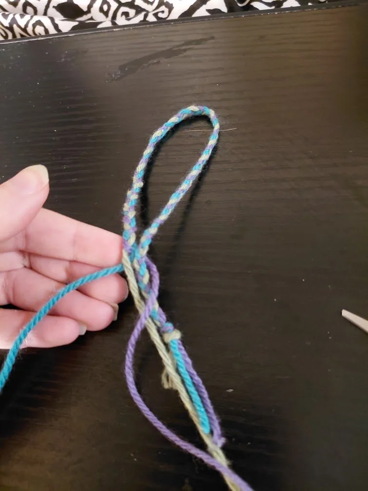 Then put the purple end over the knotted end. Keep braiding, ensuring the knotted end remains separate from the extra braiding you’re doing.